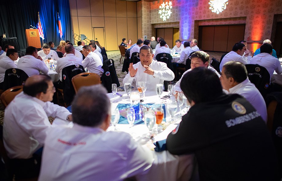 C – Operaciones de compañía con fuego en vivo. El fuego en vivo tuvo lugar en un laboratorio de 175 m² de superficie. Incluyó áreas residenciales, comerciales y de hotelería para simular una amplia variedad de escenarios. Todo el entrenamiento fue de acuerdo con NFPA 1403. Los oficiales participaron en grupos de: